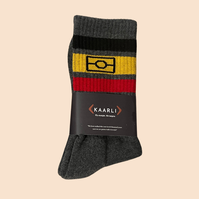 Embrace your heritage with every step by choosing our cotton crew socks, designed to reflect the vibrant colors of the Aboriginal flag. These socks are not just a statement of pride and connection to your roots but also a way to support an Indigenous-owned business that celebrates and promotes Aboriginal culture and artistry.